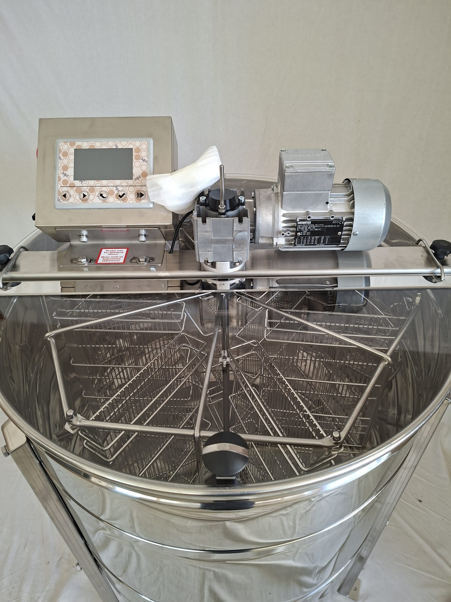 ⚠️ Die Steuerung und Deckelöffnung befinden sich zu Anschauungszwecken nach vorne gerichtet. Für eine einfachere Bestückung der Waben im Schleuderkorb erfolgt die Lieferung mit Steuerung und Deckelöffnung nach hinten.