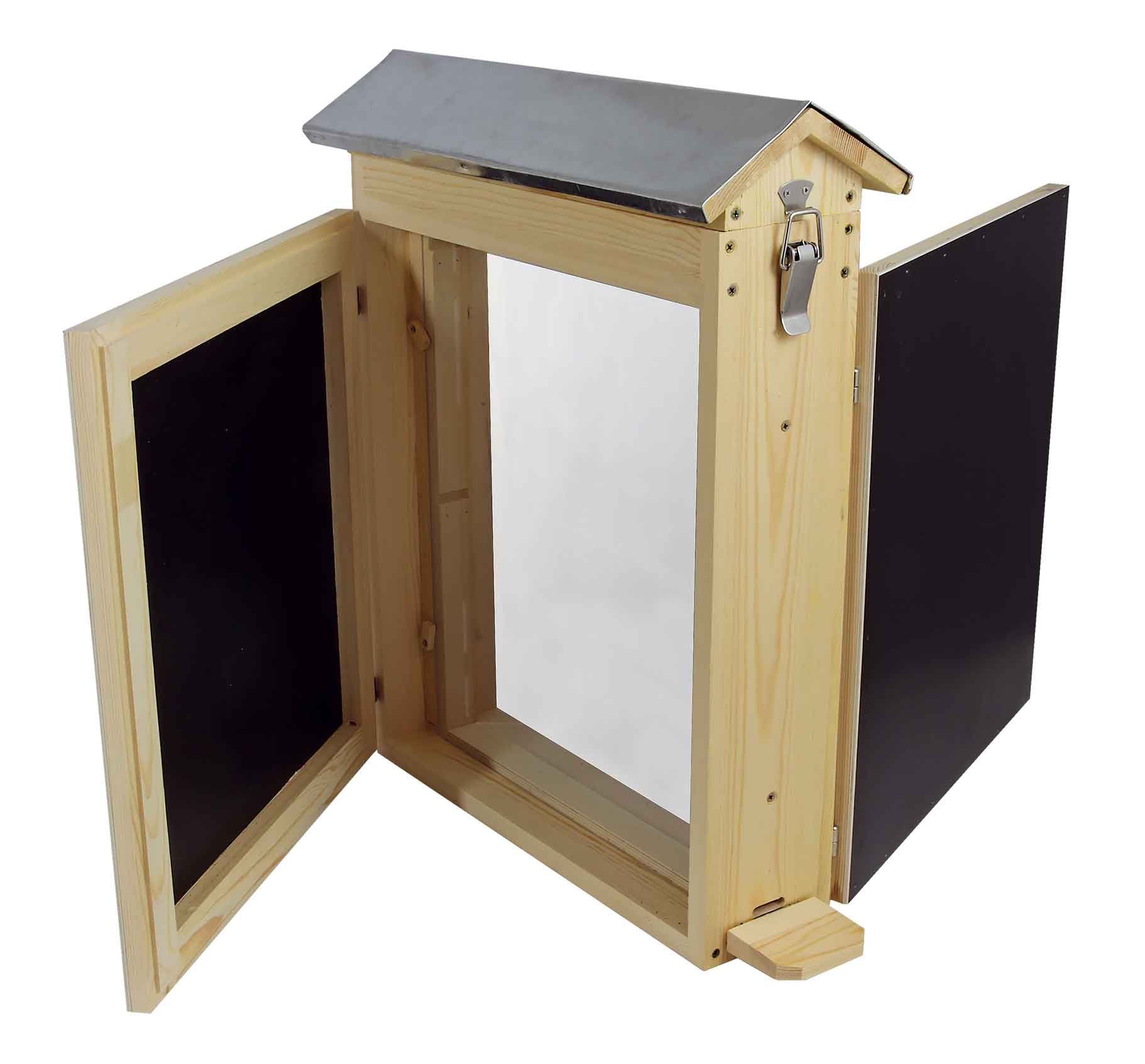 Der Schaukasten hat Platz für zwei Rähmchen übereinander in Normalmaß, Zandermaß oder Dadant. Der Futteraum ist oberliegend
