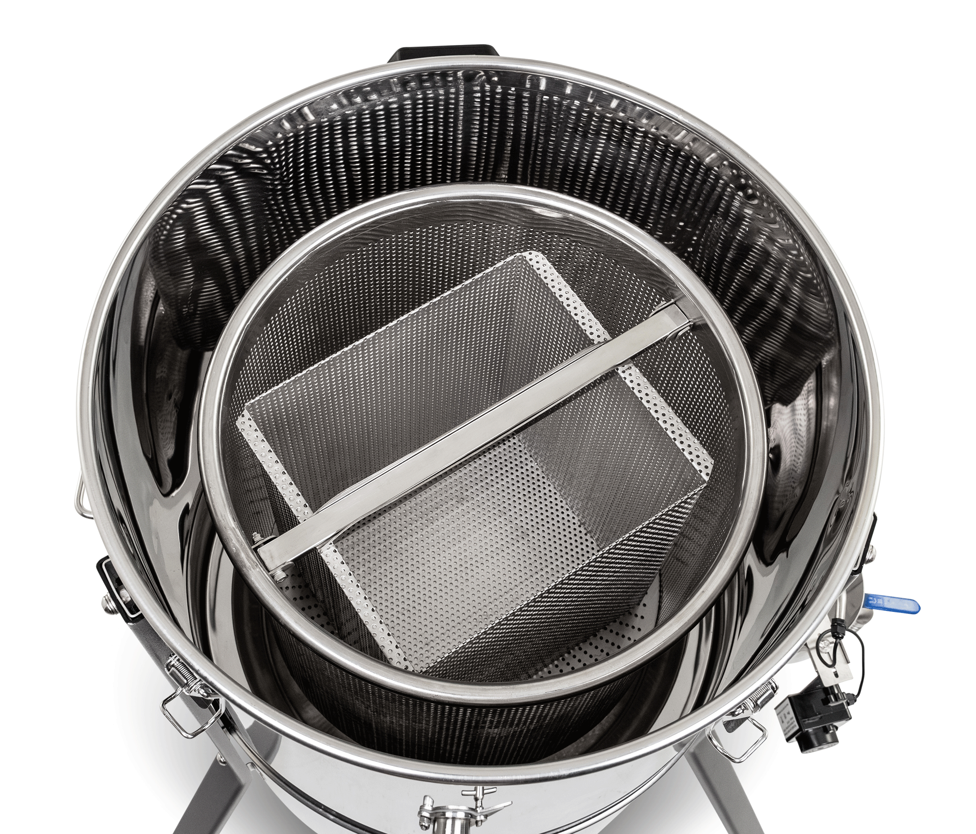Der Lochblechkorb der RuBee® Wachsschmelz- und Rähmchenwaschanlage passt optimal in die Zentrifuge.
